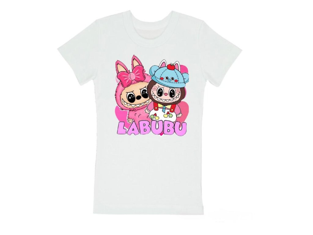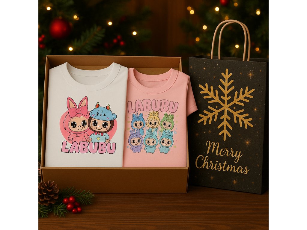 Sada obsahuje 2k balvněných triček s potiskem Labubu, dárkovou tašku + krabičku