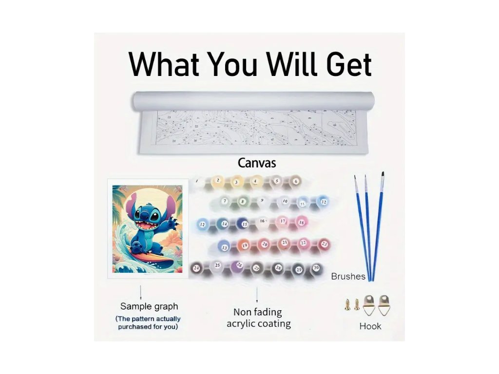 Sada obsahuje plátno, štětec a barvy. NEOBSAHUJE rám na plátno.